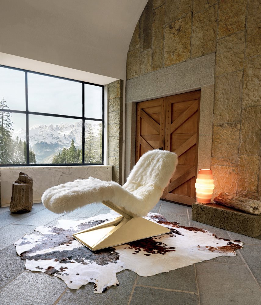 A unique, sculptural piece entirely handcrafted and upholstered in luxurious white sheepskin. This elegant chaise longue is a true expression of Mascheroni’s artisanal excellence and technical innovation.