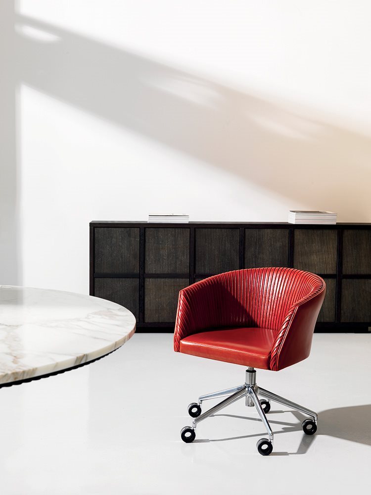 Struttura in legno multistrato lastronato con cubi accessori realizzati nel medesimo materiale. Base portante e cappello realizzati in compensato lastronato. Le ante push-pull possono essere completamente in legno o rivestite in pelle scegliendo dal campionario “Leather Colour System by Mascheroni”.